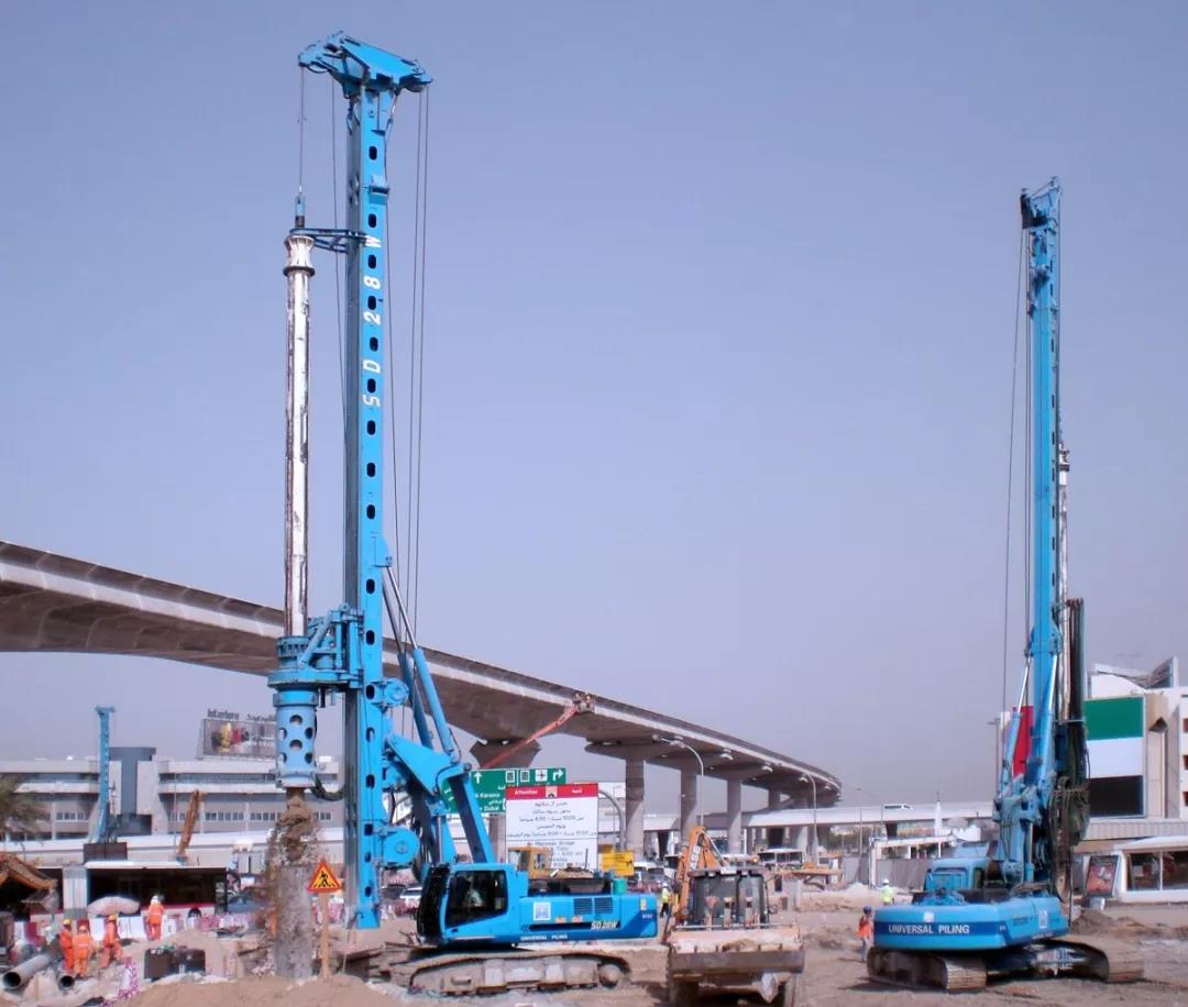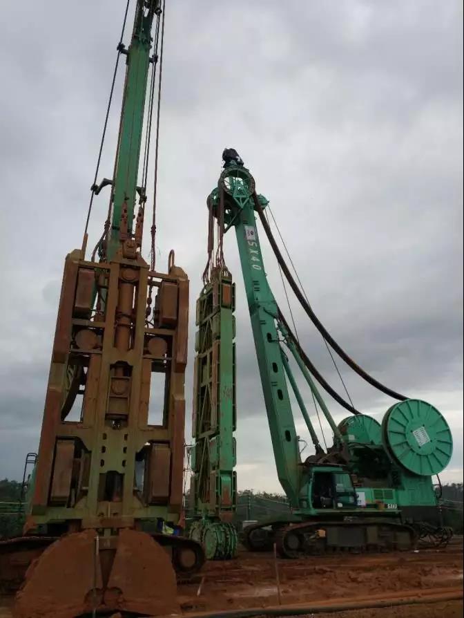此工程兩個主壩區分別為DAM E和DAM F,設計工程量分為防滲墻27,800立方米,抗滑樁146根,降壓井657口。其中防滲墻部分由我司抓斗SG50A及雙輪銑SX40A進行施工。該防滲墻,DAM E 為74副槽,DAM F 為76副槽。 槽寬1米,深度25-35米。一期槽段采用抓銑結合,二期槽槽采用套銑結合方式施工。抓斗SG50A抓至20-34米不等,雙輪銑SX40A 入巖 0.4-1米不等,個別槽段入巖7米。截至目前設備安全、穩定、可靠,施工效率平均1.5副/天。由于事先金泰公司與用戶進行了深入溝通和了解,設備選型準確,符合當地施工條件。因此施工效率完全符合用戶要求,得到了用戶與相關國家的充分認可。