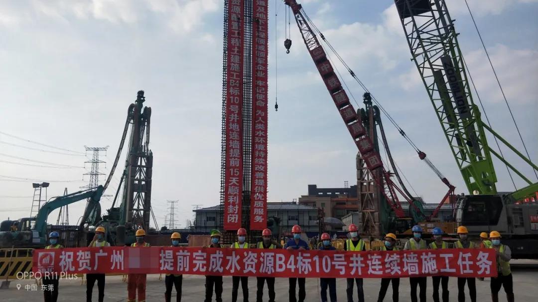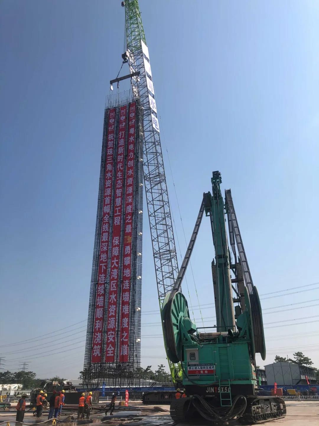 水資源項目連續墻施工主要配備雙輪銑槽機、旋挖鉆機、成槽機等設備。其中,被譽為樁工機械家族“奢侈品”的雙輪銑,作為目前國際上先進的地下連續墻施工專用設備,通過更換不同類型的刀具即可在不同硬度地質中開挖。銑槽機在復雜地層條件下的施工效率高、精度高、適應性強,而且對環境影響和污染小,在該項目中被確定為主力設備,并投入數十臺。施工中,中外品牌同臺競技爭奇斗艷,場面蔚為壯觀,其中5臺金泰雙輪銑設備在項目中同時開展施工,SD03#工作井便是上海金泰SX50雙輪銑的杰作,鋼筋籠需沉槽到地下78米處,是上海金泰在珠三角區域最深的地下連續墻,也是在廣州做得最深的地下連續墻。