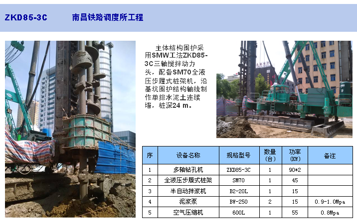 ZKD85-3C三軸鉆孔機(jī)是使用SMW工法加固軟土地基的施工設(shè)備,適合在城市高層建筑、地鐵車(chē)站和地下室的擋土、防滲連續(xù)墻施工以及在江河堤壩、水利工程施工中進(jìn)行防滲及軟土地基加固等。